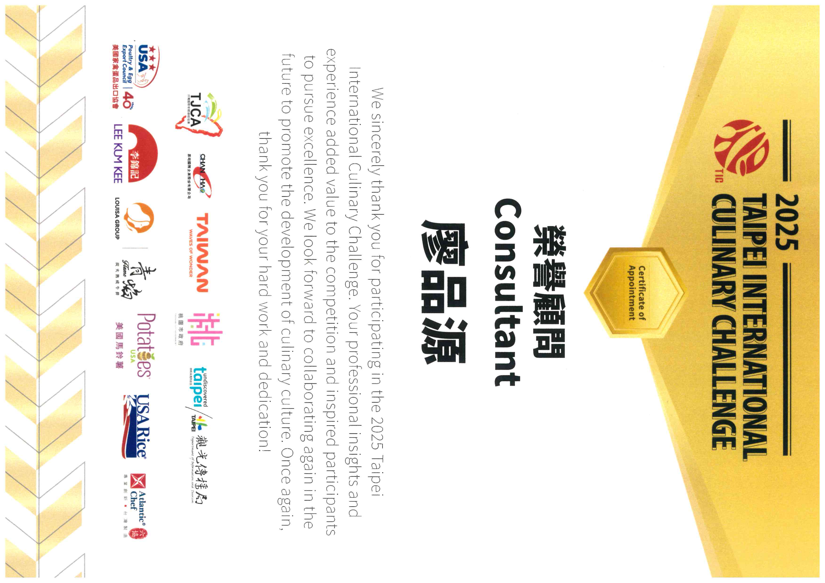 榮獲 TIC臺北國際廚藝挑戰賽 榮譽顧問 乙職