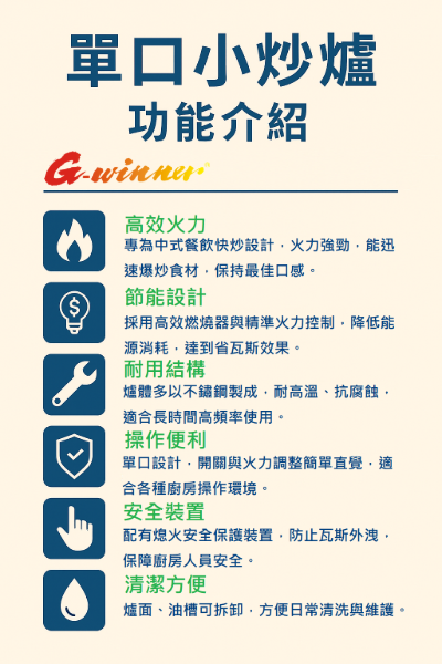 單口設計,開關與火力調整簡單直覺,適合各種廚房操作環境。