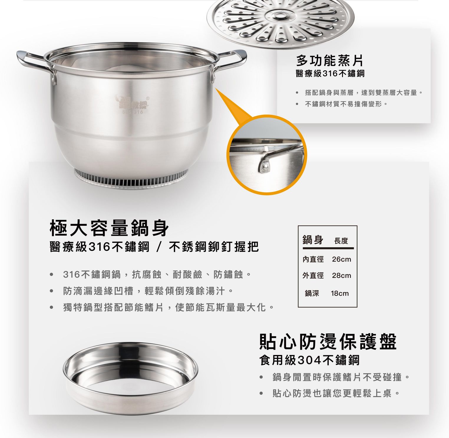 26cm SUS316 容量7L 含高壓鍋蓋、蒸籠、蒸片、保護盤